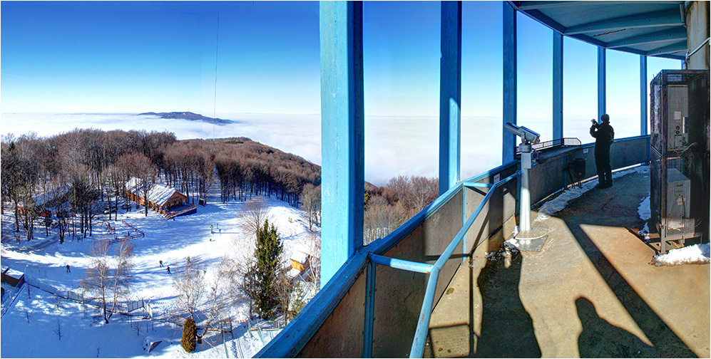 Az adótorony fűtött belsejéből, irány a szeles kilátó terasz. 12:21